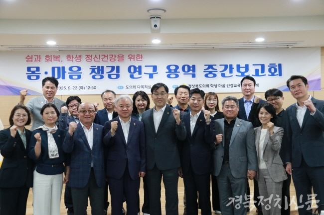 [경북정치신문=김성현 기자] 경북도의회가 학생 정신건강 증진을 위한 정책 연구에 본격 착수했다. “경상북도 학생 마음 건강교육 정책연구회” (대표 황두영 의원)는 지난 23일 도의회 다목적실에서 “쉼과 회복, 학생 정신건강을 위한 몸, 마음 챙김 연구” 중간 보고회를 열고 구체적인 정책 해법을 모색했다.