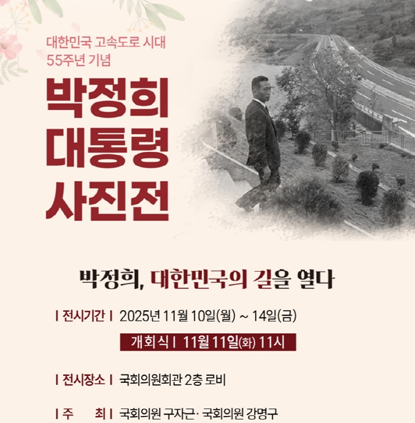 [경북정치신문=이관순 기자] 대한민국 산업화의 상징인 고속도로 시대 55주년과 박정희 전 대통령 탄생 108주년을 맞아, 국회에서 박정희 대통령의 리더십과 시대정신을 돌아보는 사진전이 열린다.