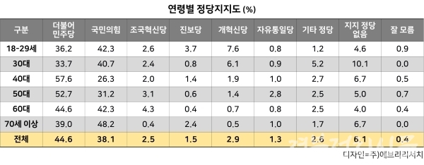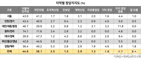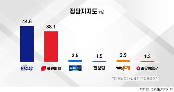 정당 지지도는 △더불어민주당 44.6% △국민의힘 38.1% △개혁신당 2.9% △조국혁신당 2.5% △진보당 1.5% △자유통일당 1.3% 순으로 나타났다. 기타 정당 2.6%, 지지정당 없음 6.1%, 잘 모르겠다 0.4%였다.