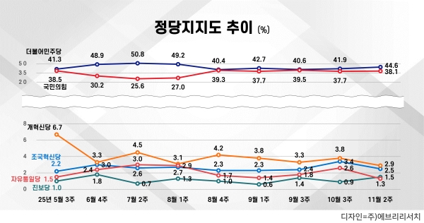 여기에 더해 이재명 전 대통령 재판 재개 논란 등 정치적, 사법적 이슈가 중, 장년층과 중도층 민심에 변수로 떠오르는 가운데 11월 둘째 주 정당 지지도 조사에서 더불어민주당 44.6%, 국민의힘 38.1%로 나타나며 민주당이 6.5%p 격차로 우위를 이어갔다.