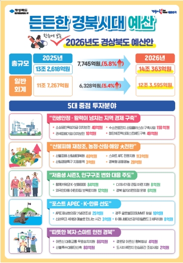[경북정치신문=홍내석 기자] 경상북도가 2026년도 본 예산을 14조 363억 원 규모로 편성해 도의회에 제출했다. 올해보다 7,745억 원(5.8%) 늘어난 규모로, 어려운 상황 속에서도 민생과 미래 성장 분야에 투자를 확대하겠다는 의지가 담겼다.