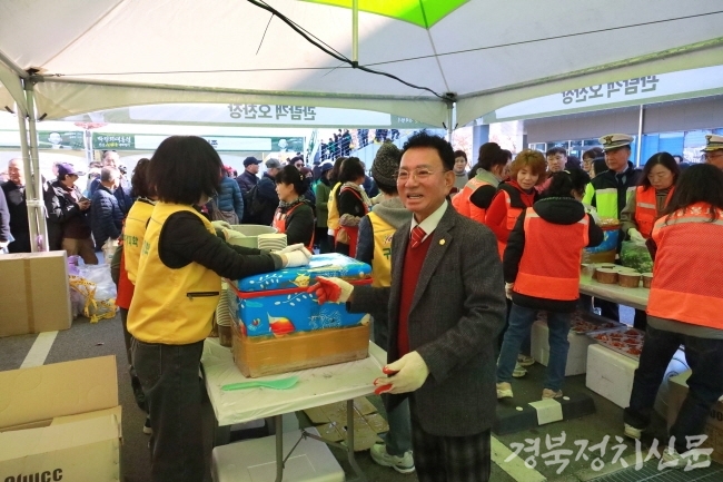 | 구미회 이승영 회장이 탄신제 참석한 시민들에게 카렌다를 나누어 주고 있다 |