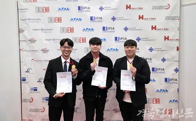 금오공과대학교 기계공학과 석사과정 학생들이 독일 뉘른베르크에서 열린 ‘2025 국제 아이디어·발명·신제품 전시회(iENA 2025)’에서 대학부문 금상(Gold Prize) 을 수상했다. 수상자 왼쪽부터 성은총, 김범석, 우찬민 학생 |