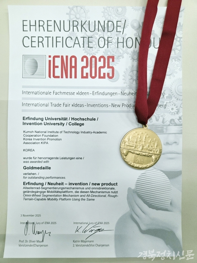 [경북정치신문=이세연 기자] 국립금오공과대학교 지능로보틱스연구실(지도교수 주백석) 소속 기계공학과 석사과정 학생들이 독일 뉘른베르크에서 열린 ‘2025 국제 아이디어·발명·신제품 전시회(iENA 2025)’에서 대학부문 금상(Gold Prize) 을 수상했다.