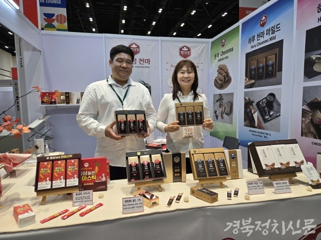 상주시에서는 문장대 천마농원이 지역 농식품을 대표해 참여했다. 해당 업체는 천마를 활용한 다양한 가공 제품을 생산하고 있으며, 천마 특유의 맛과 향을 개선하는 기술을 확보해 글로벌 시장에서도 경쟁력을 갖춘 것으로 평가된다. 천마는 동의보감, 본촌강목 등에도 효능이 기록된 한방재료로, 해외에서도 기능성 식품 수요가 높아 관심이 집중됐다.