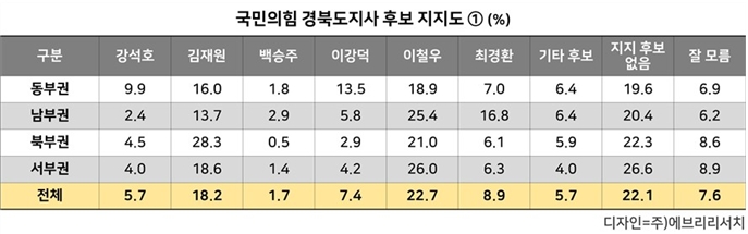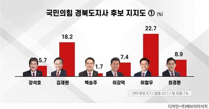 이철우 현 경북도지사를 포함한 6명을 대상으로 한 여론조사 결과 국민의힘 경북도지사 후보 지지도는 이철우 22.7%, 김재원 18.2%, 최경환 8.9%, 이강덕 7.4%, 강석호 5.7%, 백승주 1.7% 순으로 나타났으며, 기타 후보 5.7%, 지지 후보 없음 22.1%, 잘 모르겠다 7.6%로 조사되었다. (이하 여론조사 대상은 성명으로)