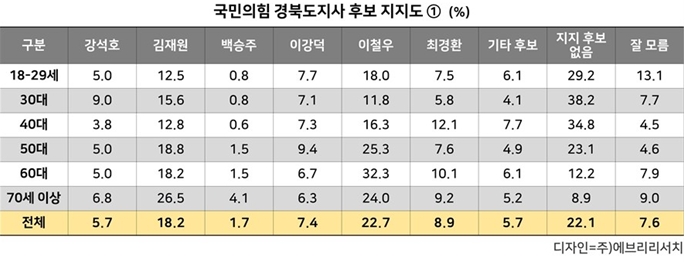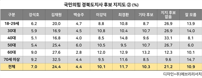 이철우 현 도지사를 제외한 지지도 연령별 조사 결과, 4회의 국민의힘 최고위원 당선과 방송 출연으로 인지도가 높은 것으로 평가 받고 있는 김재원이 24.4%의 지지율로 1강, 최경환 이강덕 강석호가 3중, 백승주가 1약의 지지율로 나타났다.