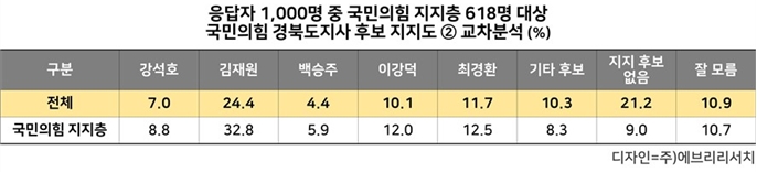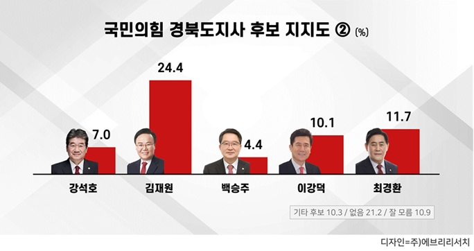 이철우 후보를 제외한 국민의힘 경북도지사 출마예상자들의 지지도는 김재원 24.4%, 최경환 11.7%, 이강덕 10.1%, 강석호 7.0%, 백승주 4.4% 순으로 나타났으며, 기타 후보 10.3%, 지지 후보 없음 21.2%, 잘 모르겠다 10.9%로 조사되었다.