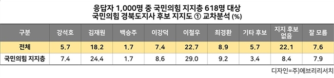 응답자 1,000명 중 국민의힘 지지층 618명을 대상으로 교차분석한 결과, 이철우와 김재원이 두 자릿수 지지율과 오차범위 내로 2강, 최경환 이강덕 강석호의 3중, 백승주의 1약의 지지율로 해석할 수 있는 조사 결과이다.