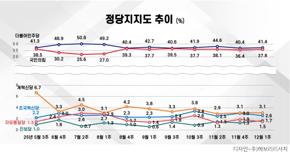 지난 11월 넷째 주 조사 대비 민주당은 1%p, 국민의힘은 1.4%p 상승해 양당 간 격차는 3.6%p로 집계됐다.