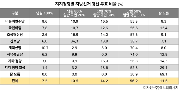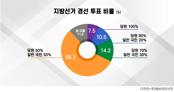지방선거 경선 투표 비율에 대한 선호도 조사 결과, 국민 과반이 넘는 56.2%가 ‘당원 50% + 일반 국민 50%’ 방식을 선택했다.