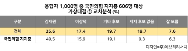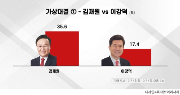 김재원 후보와 이강덕 후보 간 가상대결에서는 김재원 후보가 35.6%, 이강덕 후보가 17.4%, 기타 후보 19.7%,지지 후보 없음 19.7%, 잘모르겠다 7.6%를 기록했다. 두 후보 간 격차는 18.2%p로, 김재원 후보가 뚜렷한 우위를 보였다.