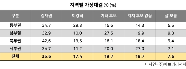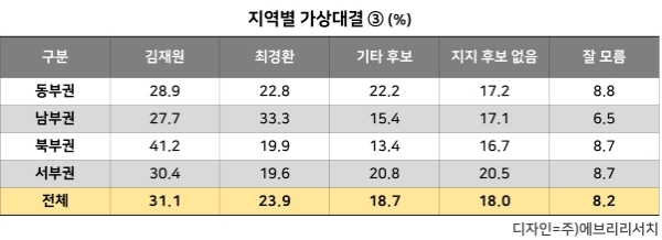 지역별로는 남부·북부·서부권에서 김재원 후보가 확실한 우위를 보였으며, 동부권에서는 오차범위 내 접전 양상을 보였다. 국민의힘 지지층만을 대상으로 한 교차분석에서는 김재원 후보가 49.5%를 얻어 이강덕 후보(15.9%)를 크게 앞섰다.