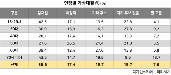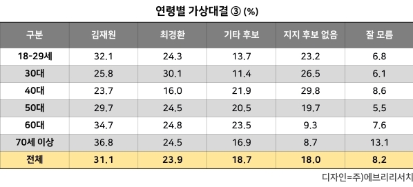 연령별로는 50대를 제외한 모든 연령층에서 김재원 후보가 오차범위를 벗어난 우세를 나타냈다. 특히 18~29세(42.5%), 60대(39.4%), 70세 이상(43.5%)에서 김재원 후보 지지가 높았다.