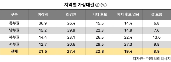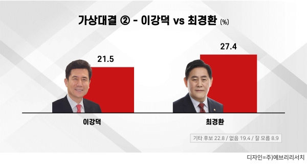이강덕 후보와 최경환 후보 간 가상대결에서는 최경환 후보가 27.4%, 이강덕 후보가 21.5%로 나타났다. 격차는 5.9%p로 최경환 후보가 앞섰다.