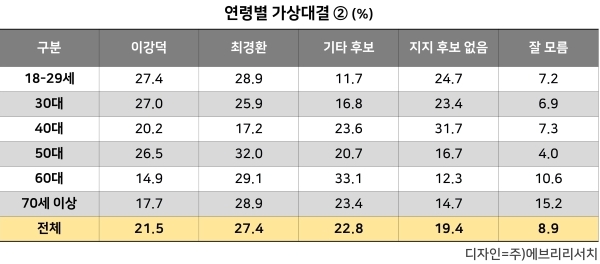 연령별로는 50대 이하에서는 접전 양상을 보였지만, 60대와 70세 이상에서는 최경환 후보가 오차범위를 벗어난 우위를 보였다.