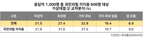국민의힘 지지층 대상 조사에서도 최경환 후보가 31.0%로 이강덕 후보21.9%를 앞섰다.