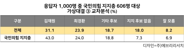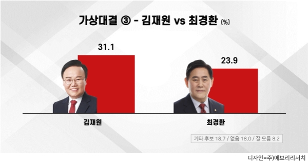김재원 후보와 최경환 후보 간 가상대결에서는 김재원 후보가 31.1%, 최경환 후보가 23.9%를 기록했다. 격차는 7.2%p로 김재원 후보가 우위를 유지했다.