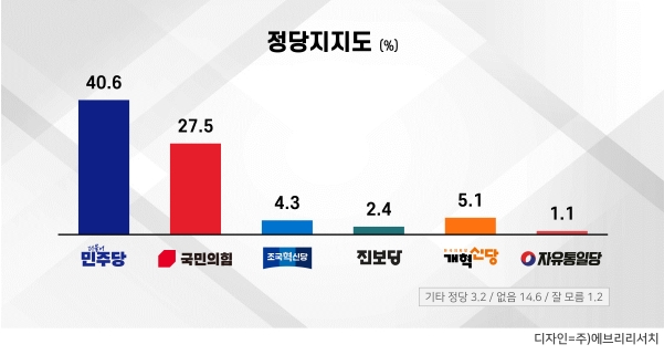 같은 조사에서 정당지지도는 더불어민주당 40.6%, 국민의힘 27.5%로 조사됐다. 이어 개혁신당 5.1%, 조국혁신당 4.3%, 진보당 2.4%, 자유통일당 1.1% 순이었으며, 기타 정당 3.2%, 지지 정당 없음 14.6%, 잘 모르겠다. 1.2% 집계됐다.