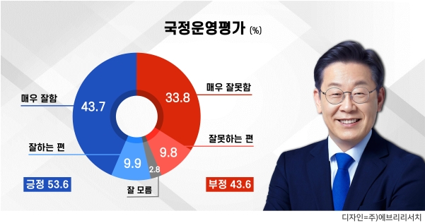 여론조사전문기관 ㈜에브리리서치가 1월 9~10일 양일간 실시한 정기 여론조사 결과 이재명 대통령의 국정운영에 대해 “잘하고 있다”는 긍정평가는 53.6%, “잘못하고 있다”는 부정평가는 43.6%로 조사 됐다. 세부적으로는 ‘매우 잘하고 있다’ 43.7% ‘잘하는 편이다’ 9.9%였으며, 부정 평가는 ‘매우 잘못하고 있다’33.8%, ‘잘못하는 편이다’ 9.8%였다. ‘잘 모르겠다’는 응답은 2.8%였다.