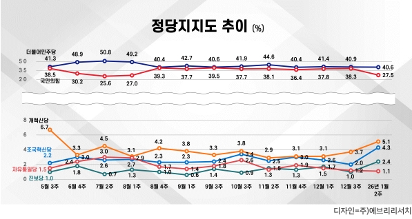 같은 기간 조국혁신당은 2.3%, 진보당과 개혁신당은 각각 1.4% 상승하며 군소정당 지지율은 전반적으로 상승세를 보였다.