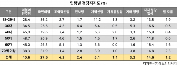 40대에서는 민주당 45.0%, 국민의힘 19.6%로 오차범위 밖의 격차가 확인됐으며, 70세 이상에서도 민주당이 38.3%로 국민의힘(31.9%)을 오차범위 밖에서 앞선 것으로 나타났다.