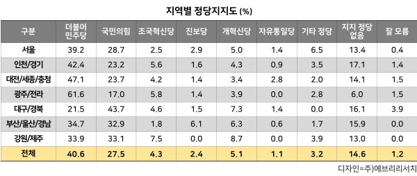 지역별로는 서울, 인천·경기, 대전·세종·충청권에서 민주당이 오차범위 밖 우세를 보였고, 부산·울산·경남에서는 민주당이 34.7%, 국민의힘 32.9%로 박빙 양상이 나타났다.