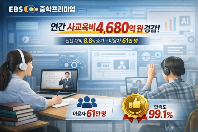 [경북정치신문=이세연 기자] EBS가 중학생 대상 온라인 학습 서비스 ‘EBS 중학 프리미엄’ 전면 무료화에 따른 사교육비 경감 효과를 분석한 결과, 연간 약 4,680억 원의 사교육비 절감 효과가 발생한 것으로 조사됐다고 밝혔다, 이는 2024년 대비 약 8.8% 증가한 수치다.