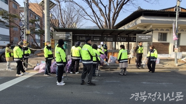 | 상모자율방범대가 상모동 일대 상모 지하도 입구와 원룸 밀집지역을 중심으로 생활 쓰레기 수거와 주변 환경 정비를 실시했다. |