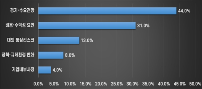 기업들이 경영계획을 세우는 데 가장 크게 고려한 요인은 경기 및 수요 전망 44.0% 이었다. 이어 비용, 수익성 요인 31.0%, 대외 리스크 13.0%, 정책, 규제 환경 변화 8.0% 순으로 나타났다.