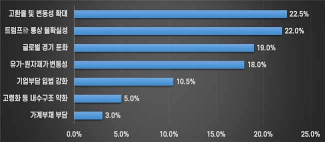 기업들이 꼽은 한국 경제의 가장 큰 하방 요인은 고환율 및 환율 변동성 확대22.5%였다. 이어 트럼프발 통상 불확실성 22.0%, 글로벌 경기 둔화 19.0%, 유가, 원자재 가격 변동성 18.0%가 뒤를 이었다. 이는 구미 제조업이 수출, 글로벌 공급망과 직결된 구조임을 다시 한번 보여주는 대목이다.