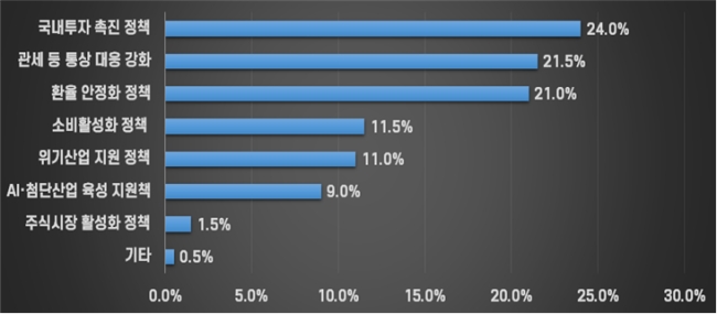 2026년 경제 활성화와 실적 개선을 위해 정부가 우선 추진해야 할 정책으로는 ▲국내 투자 촉진 24.0% ▲관세 등 통상 대응 강화 21.5% ▲환율 안정화 정책 21.0%을 가장 많이 꼽았다. 이 외에도 소비 활성화 11.5%, AI 첨단산업 육성 정책에 대한 요구도 뒤를 이었다.