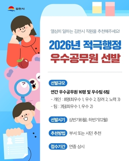 | 김천시는 행정서비스 향상과 공익 증진, 사회문제 해결을 위해 2026년도 적극행정 우수공무원을 선발한다 |