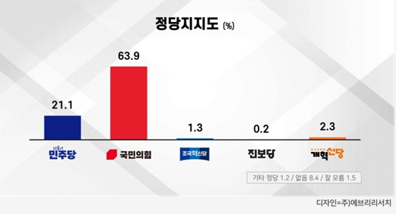 정당 지지도는 지역 정치 성향다운 지지율을 보이며 ‘더불어민주당’ 21.9%, ‘국민의힘’ 63.9%로 양당의 지지율 격차는 오차범위 밖 격차로 국민의힘 우세. ‘지지 정당 없음’ 8.4%, ‘잘 모르겠다’ 1.5%, ‘기타 정당’ 1.2%로 나타냈다.