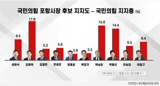 국민의힘 지지층만을 대상으로 한 조사에서도 비슷한 흐름이 확인됐다. 김병욱 17.8%, 박승호 15.8%, 박용선 14.4%, 공원식 9.5%, 이칠구 8.4%, 안승대 6.5%, 모성은 5.6%, 김일만 5.2%, 박대기 3.2%, 문충운 2.9%로 나타나며 김병욱, 박승호, 박용선 세 후보 모두 정당 지지율에서는 더 높은 지지율을 보였다.