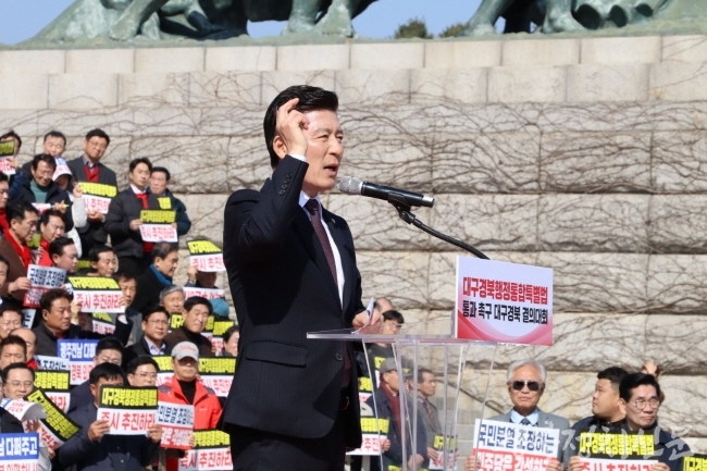 이날 결의대회 참가자들은 국회 본청 계단 앞에서 “대구경북통합특별법 즉각 통과” “수도권 일극체제 극복” “TK 메가시티 실현” 등의 구호를 외치며 국회의 신속한 법안 처리를 촉구했다.