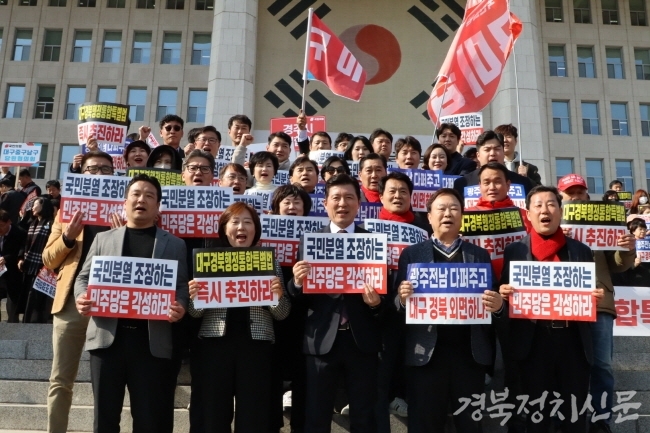 [경북정치신문=이관순 기자] 대구·경북 행정통합의 핵심 법안인 ‘대구경북통합특별법’이 국회 법제사법위원회에 계류되면서 정치권 공방이 확산되고 있다. 국회 앞에서는 TK 시도민들이 특별법 통과를 촉구하는 결의대회를 열었고, 국민의힘은 법사위 지연 책임을 더불어민주당에 돌리며 강하게 반발했다.