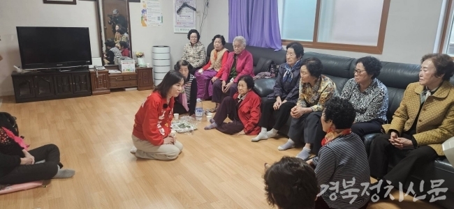 | 임명해 예비후보가 경로당을 찾아 어른신들의 이야기를 듣고 있다. |